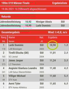 (bb/ba) An den Regionenmeisterschaften der Zentralschweiz gelang Dominic Larbi (LAR Binningen) im Final des 100m-Laufes eine formidable Leistung. Mit 10.90 lief er nicht nur das erste Mal unter die 11 Sekunden-Schallmauer, sondern erfüllte auf den Punkt genau die Limite für die U18-EM. Leider wurde dieser Anlass abgesagt.
